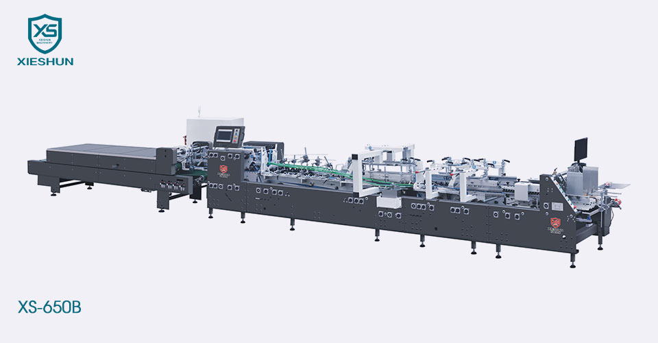 Dostawca XIESHUN XS-650B Automatyczna maszyna do klejenia z blokadą awaryjną o dużej prędkości Nadaje się do małych rozmiarów skrzynek z blokadą awaryjną i skrzynek o linii prostej przy dużej prędkości i wydajnej produkcji, stosowanych w przemyśle farmaceutycznym lub kosmetycznym. Tektura 200-800 g/m2 i tektura falista z falą N/E i falą F.